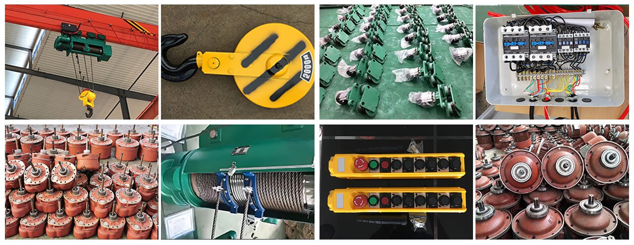 Lifting process: The operator starts the lifting motor of the electric hoist through the control system, and the motor drives the drum to rotate through the reducer, winding or releasing the steel wire rope, thereby driving the hook to achieve vertical lifting and lowering of the goods. The braking system ensures immediate braking when power is cut off or operation is stopped, preventing accidental dropping of goods.
