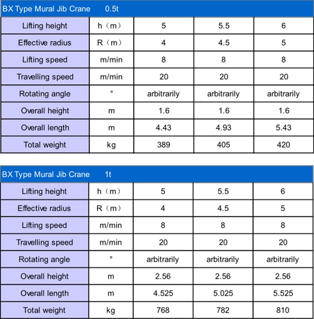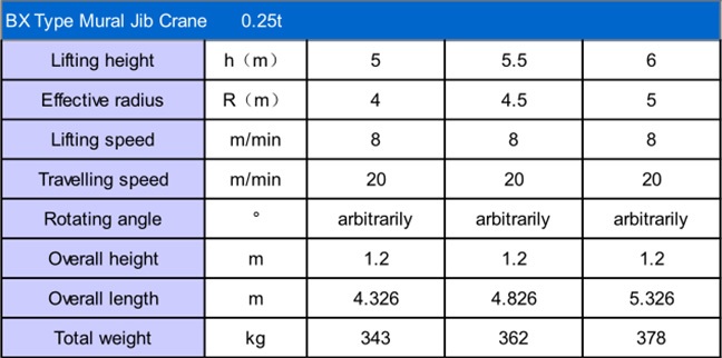 Our company supply the BX Type Mural Jib Crane with lifting capacity: 0.25~1t, Working radius:4~6m,lifting height 5~6m, low work class A3. We also design and manufacture the nonstandard crane according users’ demanding.