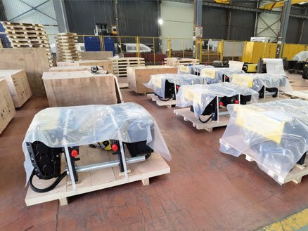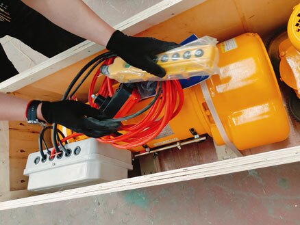 A batch of electric hoists is being packed